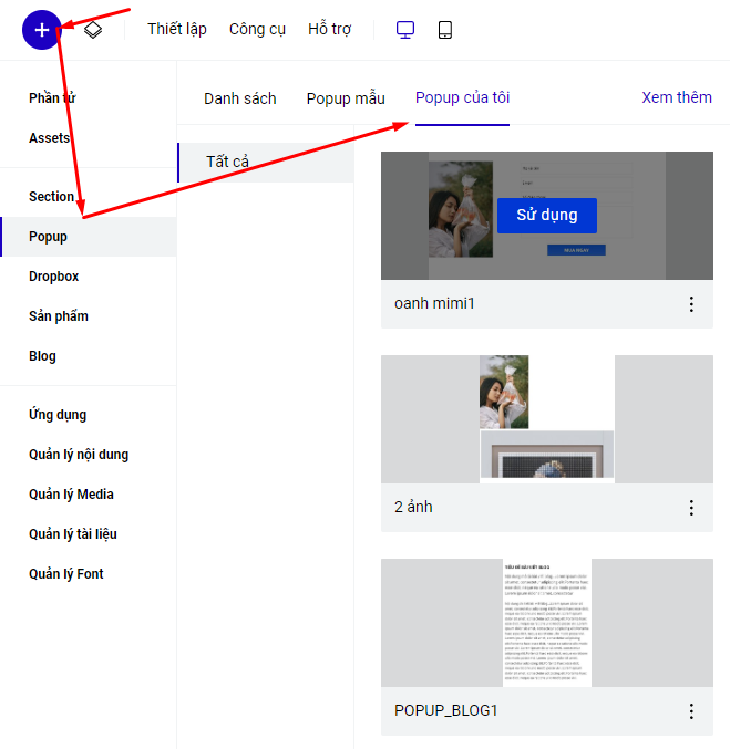Sau đó khi chọn Thêm mới Popup, bạn sẽ thấy mục Popup của tôi. Mục này sẽ hiển thị các Popup mà bạn đã lưu. Trỏ chuột vào mỗi Popup và chọn Sử dụng là bạn đã tạo ra một Popup mới với nội dung đã lưu.