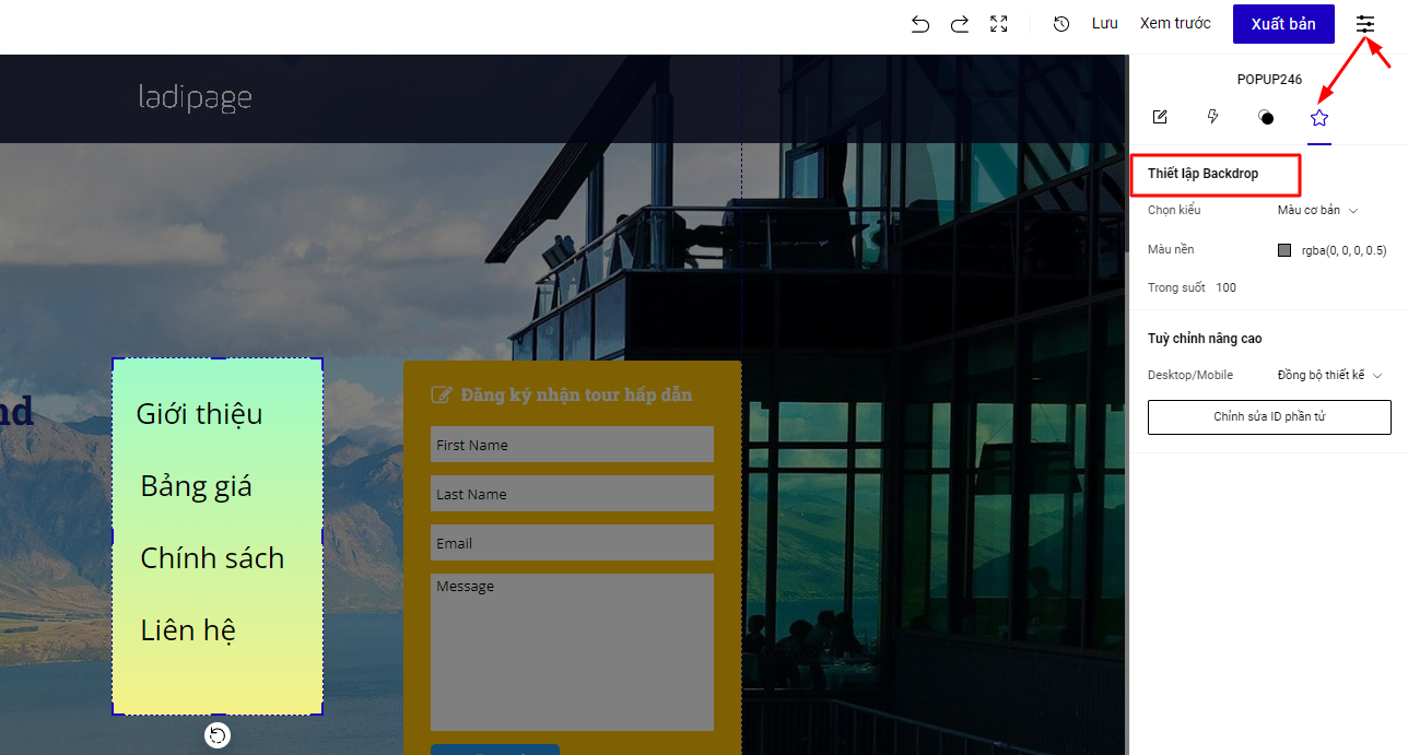 Mục Thiết lập Backdrop : Khi bạn thiết lập nội dung ở mục này, s ẽ cho phép khách hàng của bạn TẮT đi popup mà KHÔNG cần phải bấm vào nút X trên popup