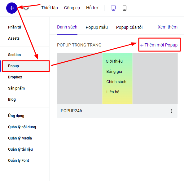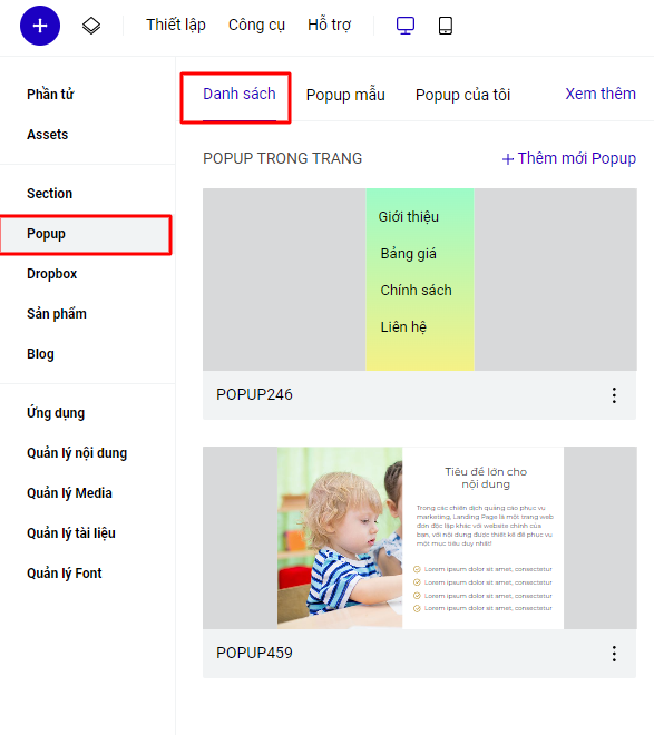 - Khi bạn "Đóng" Popup là bạn đóng cửa sổ hiển thị thiết lập Popup để quay trở lại thiết lập section và các phần tử khác. Lúc này Popup sẽ vẫn tồn tại và hiển thị trong danh sách Popup.