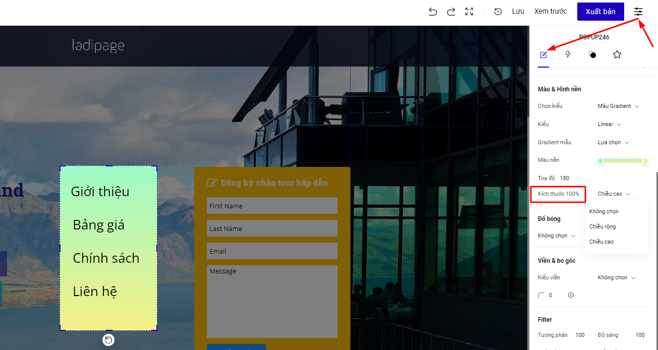 Phần kích thước 100% : cho phép bạn thiết lập hình nền của popup full theo chiều dọc hoặc chiều ngang của màn hình