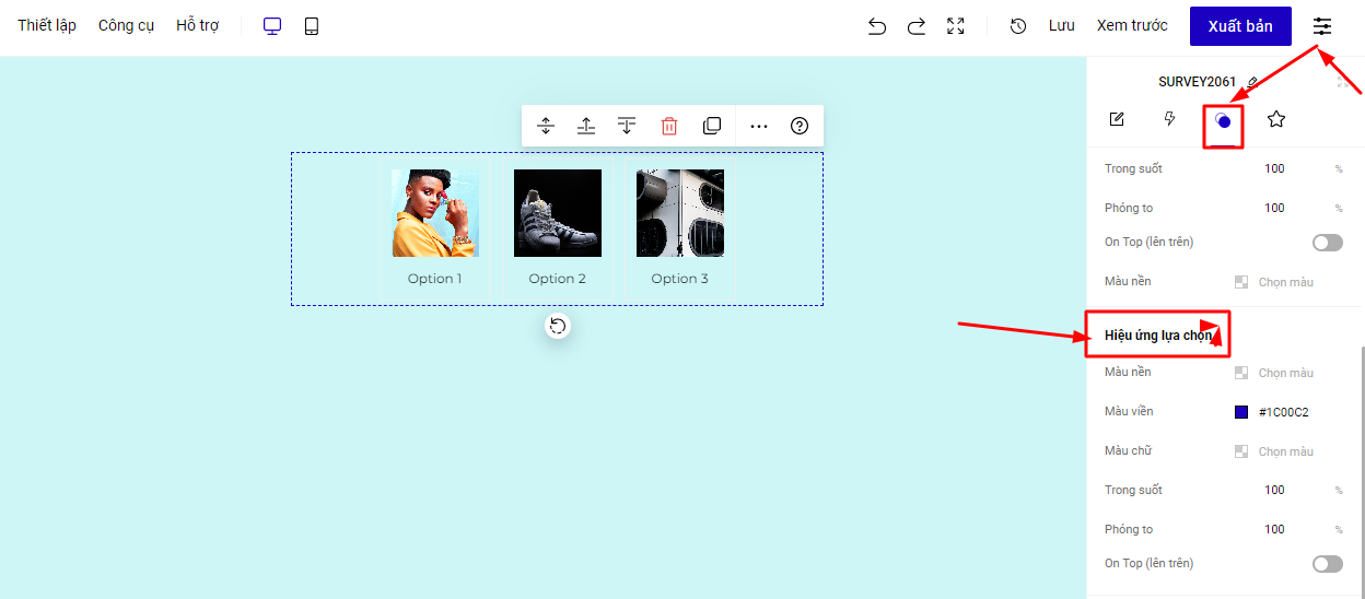 Hiệu ứng lựa chọn: phần hiển thị hiệu ứng khi bạn lựa chọn 1 nội dung trên survey