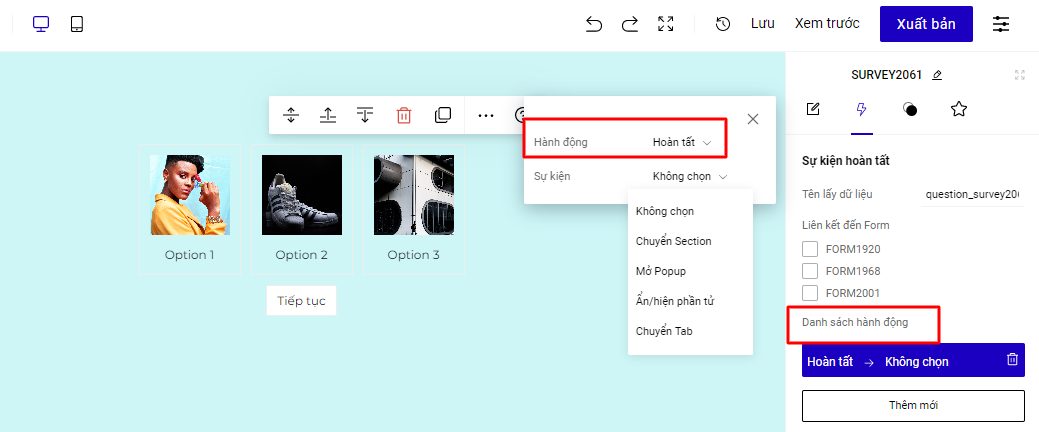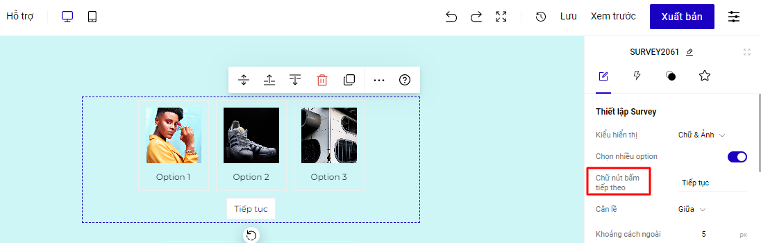 Trong trường hợp bạn thiết lập Chọn nhiều Option là Có và ở mục Sự kiện, bạn có thiết lập Sự kiện cho Survey thì sẽ hiển thị thêm nút bấm : Chữ nút bấm tiếp theo