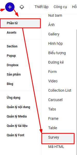 Truy cập mục Thêm mới- Phần tử- Survey để sử dụng tính năng