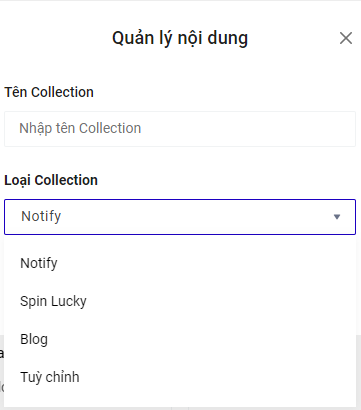 Phần quản lý nội dung chứa toàn bộ các phần thông tin liên quan đến Collection. Bao gồm 4 loai nội dung khác nhau : Notify. Spin Lucky, Blog, Tùy chỉnh