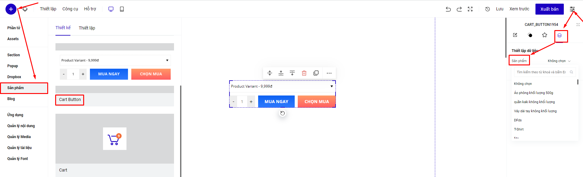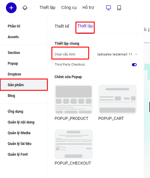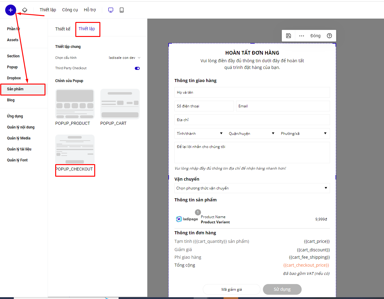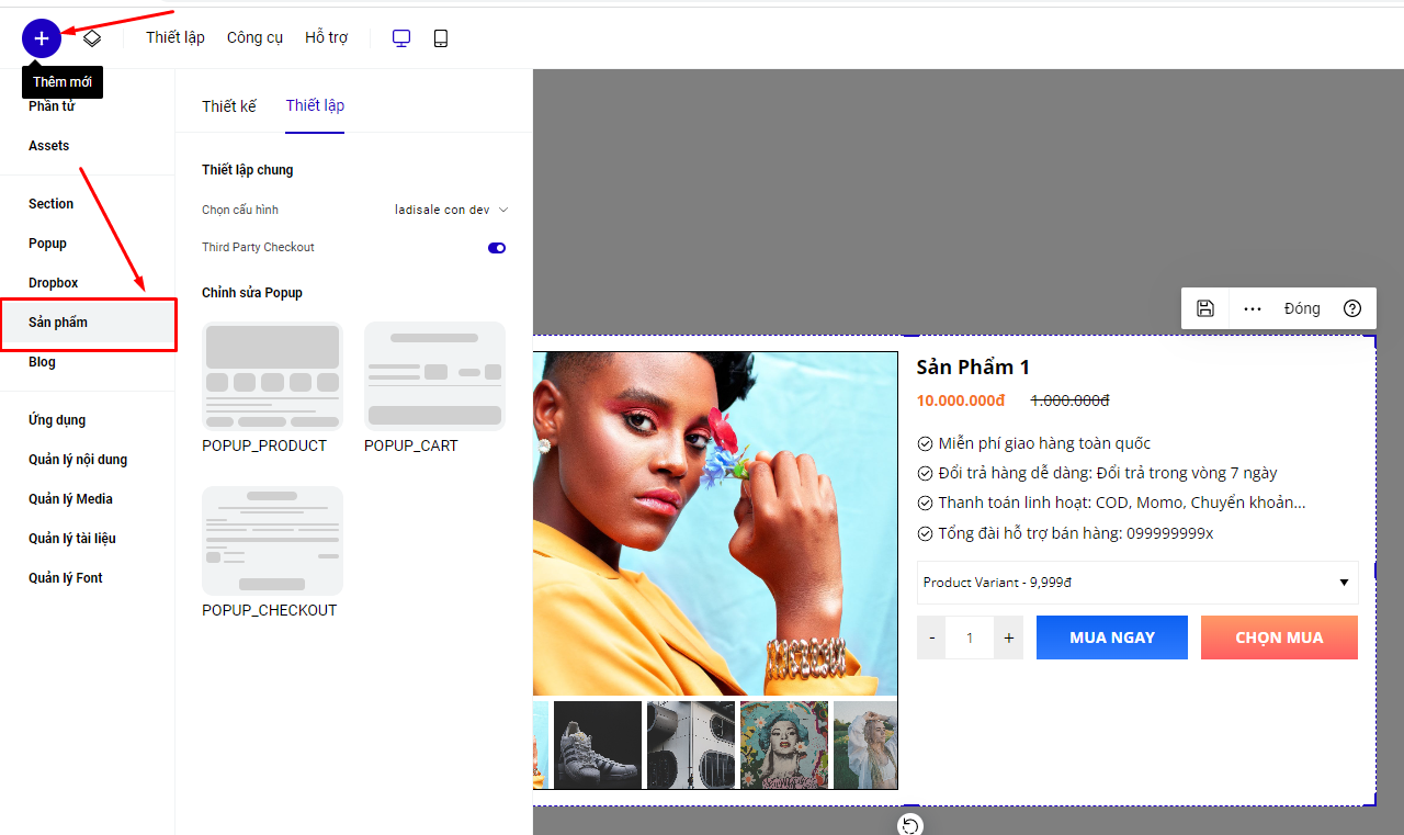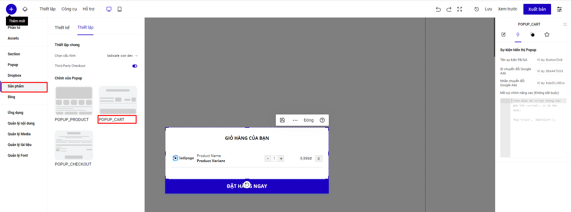 Mục sản phẩm sẽ hỗ trợ khách hàng hiển thị các sản phẩm mà bạn đã tạo bên LadiSales ( https://app.ladisales.com ), Haravan, Sapo, Shopify, Wordpress. Nội dung phần sản phẩm bao gồm Product List- giao diện hiển thị, trình bày các sản phẩm, Cart Button- hiển thị tên sản phẩm, biển thể, và nút mua hàng để khách hàng lựa chọn, Cart Icon- hiển thị danh sách các sản phẩm khách hàng đã thêm vào giỏ hàng, Popup checkout- giao diện điền thông tin đặt hàng, sản phẩm khách hàng đã lựa chọn để gửi về các kênh lưu trữ đã thiết lập