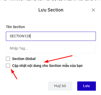 Bạn có th ể cập nhật nội dung cho Section mẫu đã Lưu, bằng cách bấm tích vào Cập nhật nội dung cho Section mẫu của bạn, chọn Section, bấm Sửa tên và Lưu lại: