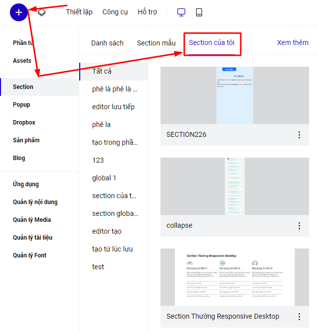 Bước 2: Để sử dụng lại section đã lưu, bạn vào phần Section, sau đó chọn vào phần Section của tôi: