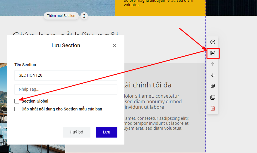 Bạn tạo 1 section như bình thường, theo những nội dung và nhu cầu thiết kế của bạn, sau đó vào mục Thiết lập Section - L ưu Section- Tích chọn vào mục Section Global - bấm Lưu.