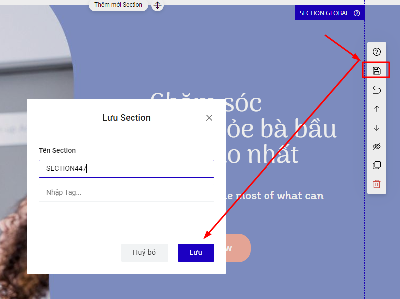 Sau khi chỉnh sửa nội dung theo mong muốn của bạn, bạn cần bấm vào nút LƯU trên Section,để có thể lưu lại nội dung vừa thao tác và cập nhật nội dung cho toàn bộ các trang landing page đang sử dụng section Global đó.