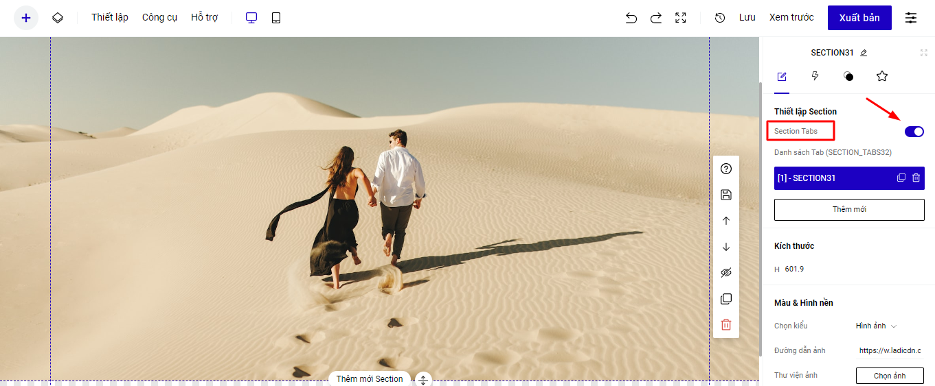 Bạn tạo mới 1 section như bình thường, sau đó ở mục Thiết kế bạn chọn Bật Section Tabs.