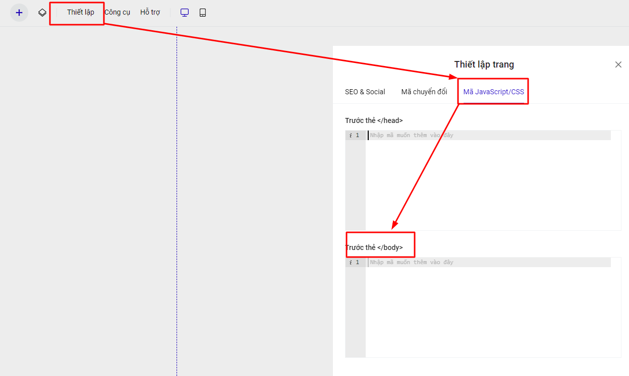 Bước 2: Dán mã vừa copy vào trước thẻ </body> trong phần thiết lập trang.