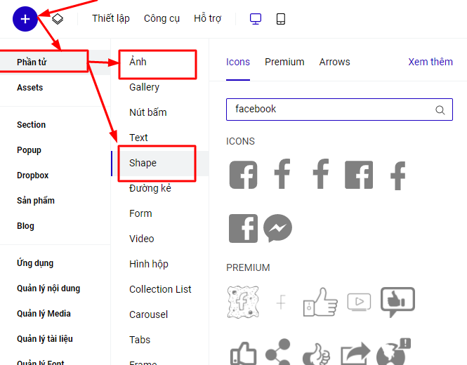 Bạn có thể vào mục Thêm mới - Phần tử - Hình ảnh để tải ảnh biểu tượng chat facebook lên ,hoặc vào mục Thêm mới- Phần tử- Icon để tìm kiếm Icon biểu tượng chat fb để sử dụng