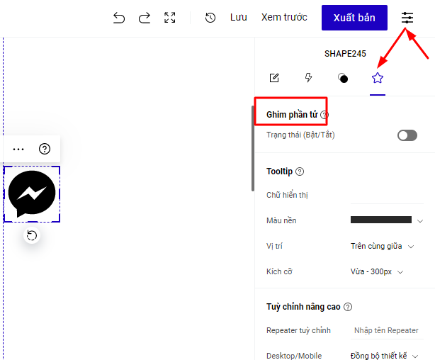 Bước 3 : Sử dụng tính năng Ghim phần tử để cố định phần hiển thị của icon chat khi khách hàng cuộn trang lên xuống