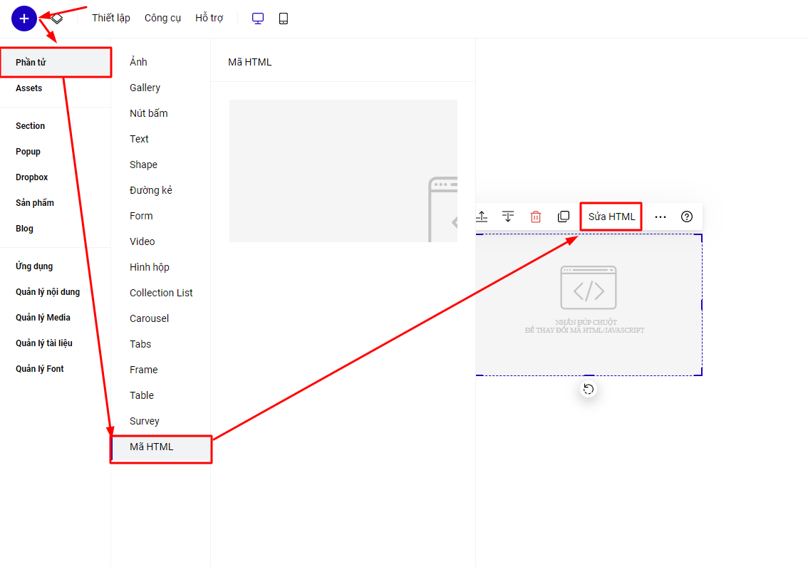 Bước 3: Dán mã code trên vào Landing Page sử dụng tính năng Mã HTML