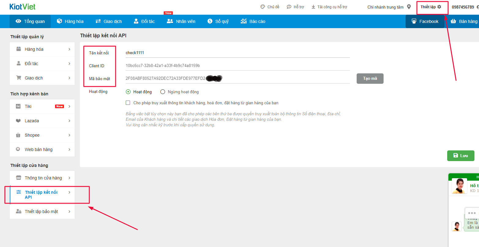 Client ID, Mã bảo mật: lấy từ tài khoản KiotViet của bạn.