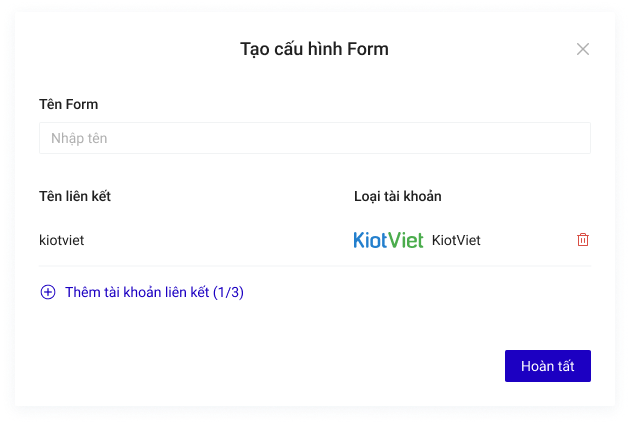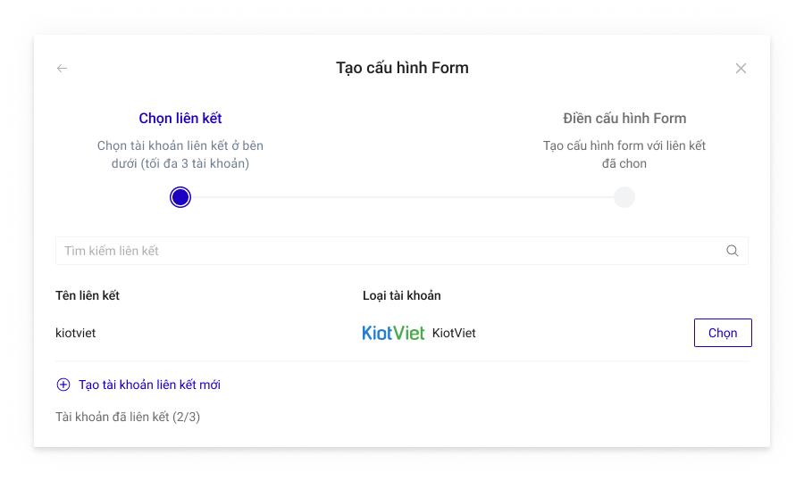 Truy cập trang builder.ladipage.com, chọn menu Landing Pages -> Cấu hình form-> Tạo cấu hình form -> Form data -> Tạo tài khoản liên kết .Sau đó lựa chọn Loại tài khoản là KiotViet