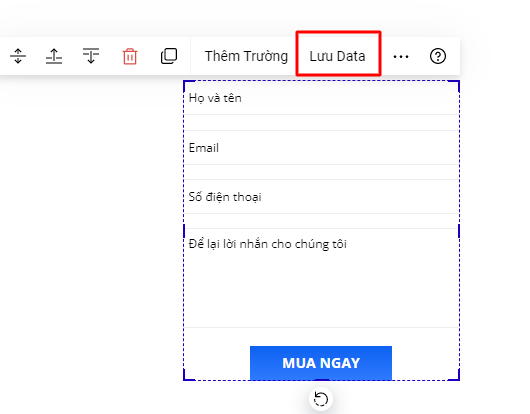 Quay trở lại form trên trang Landing Page, chọn toàn form bạn đang muốn cài đặt và chọn "Lưu data":
