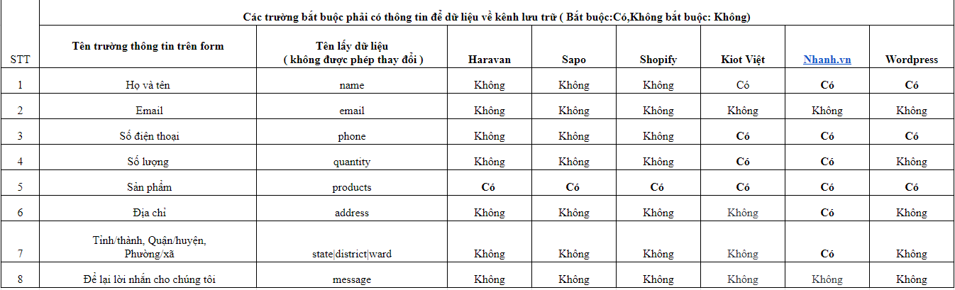 Số lượng trường dữ liệu tối đa có thể gửi về các nền tảng là 8 trường, nhưng không phải lúc nào form đăng ký của bạn cũng đủ 8 trường thông tin đó. Mỗi nền tảng sẽ quy định những trường dữ liệu bắt buộc phải có thông tin thì đơn hàng mới về kênh lưu trữ. Thông tin chi tiết liệt kê ở bảng dưới đây.