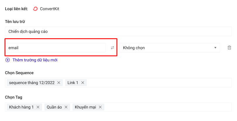 Cách 3 : Truy cập builder chỉnh sửa trang landingpage muốn lưu data về Convertkit, ở phần Form đăng ký, mục Lưu data, bấm Thêm mới , chọn Tạo liên kết ->Loại tài khoản là Convertkit