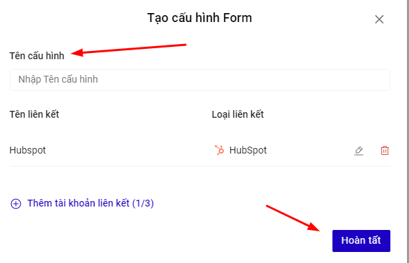 Bạn có thể chọn thêm tài khoản liên kết khác cho Cấu hình này. Mỗi cấu hình được chứa tối đa 3 tài khoản liên kết, tương đương với 3 nguồn lưu trữ thông tin khách hàng đồng thời nhận được từ form đăng ký trên Landing Page.