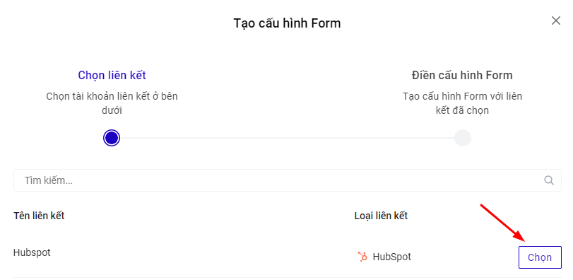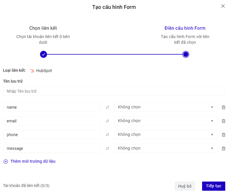 Cách 3 : Truy cập builder chỉnh sửa trang landingpage muốn lưu data về Hubspot, ở phần Form đăng ký, mục Lưu data, bấm Thêm mới , chọn Tạo liên kết ->Loại tài khoản là Hubspot\