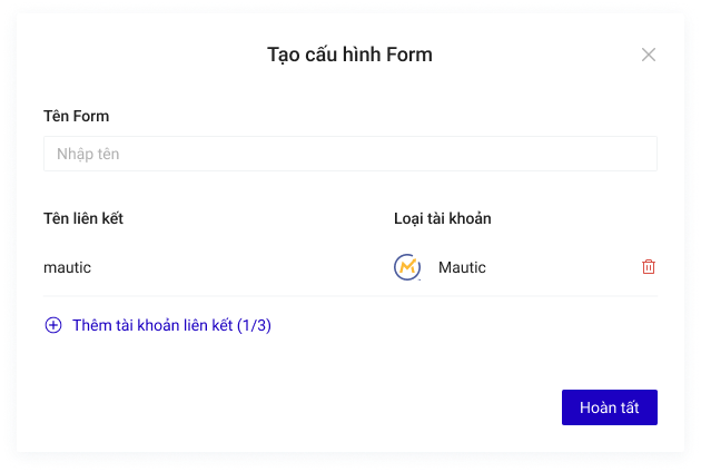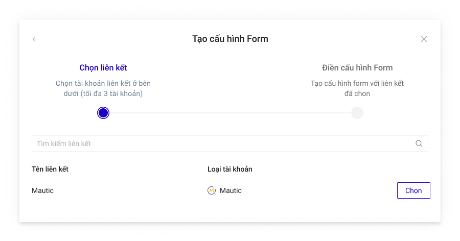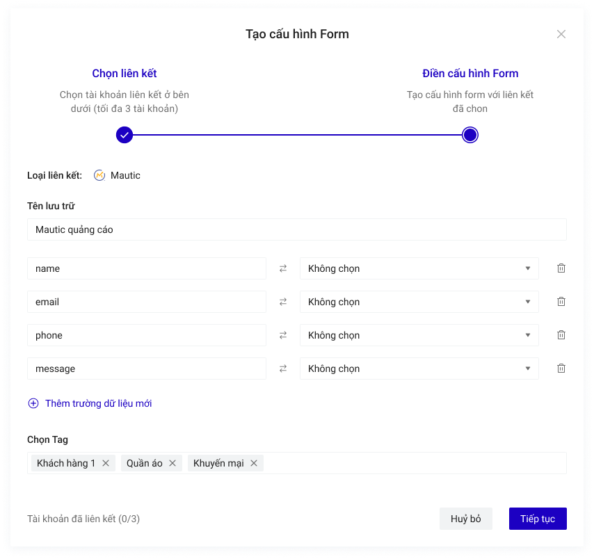 Bạn có thể chọn thêm tài khoản liên kết khác cho Cấu hình này. Mỗi cấu hình được chứa tối đa 3 tài khoản liên kết, tương đương với 3 nguồn lưu trữ thông tin khách hàng đồng thời nhận được từ form đăng ký trên Landing Page.