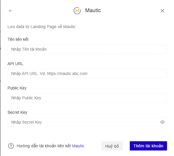 Truy cập trang builder.ladipage.com, chọn menu Cài đặt -> Tích hợp-> Tài khoản liên kết. Sau đó lựa chọn Loại tài khoản là Mautic