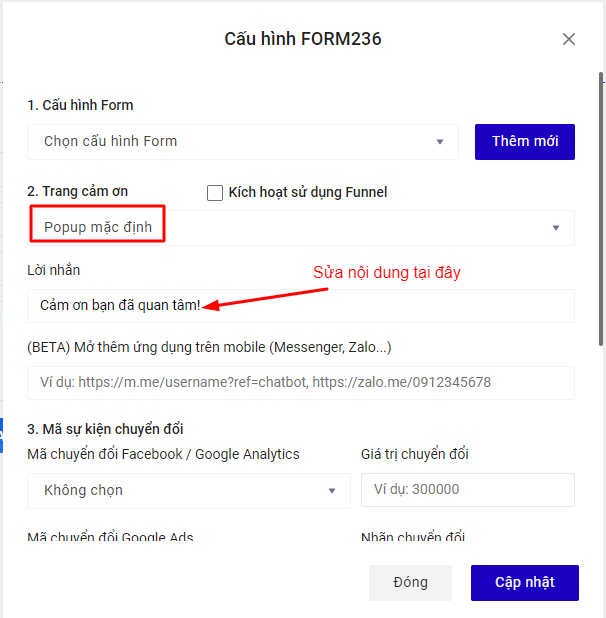 Popup cảm ơn mặc định là popup mà LadiPage cài đặt sẵn cho mỗi form. Bạn có thể thay đổi nội dung của Lời nhắn, nhưng không thể thay đổi thiết kế của Popup cảm ơn mặc định: