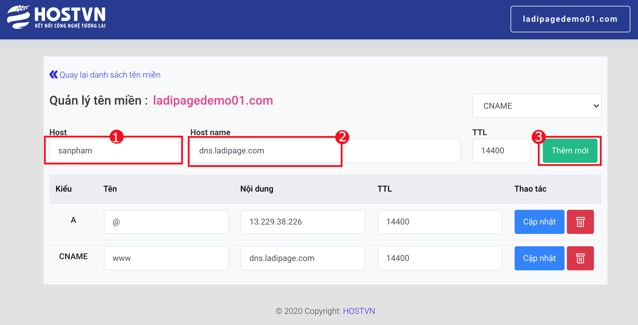 Để trỏ tên miền phụ về LadiPage bạn thực hiện theo các bước sau: