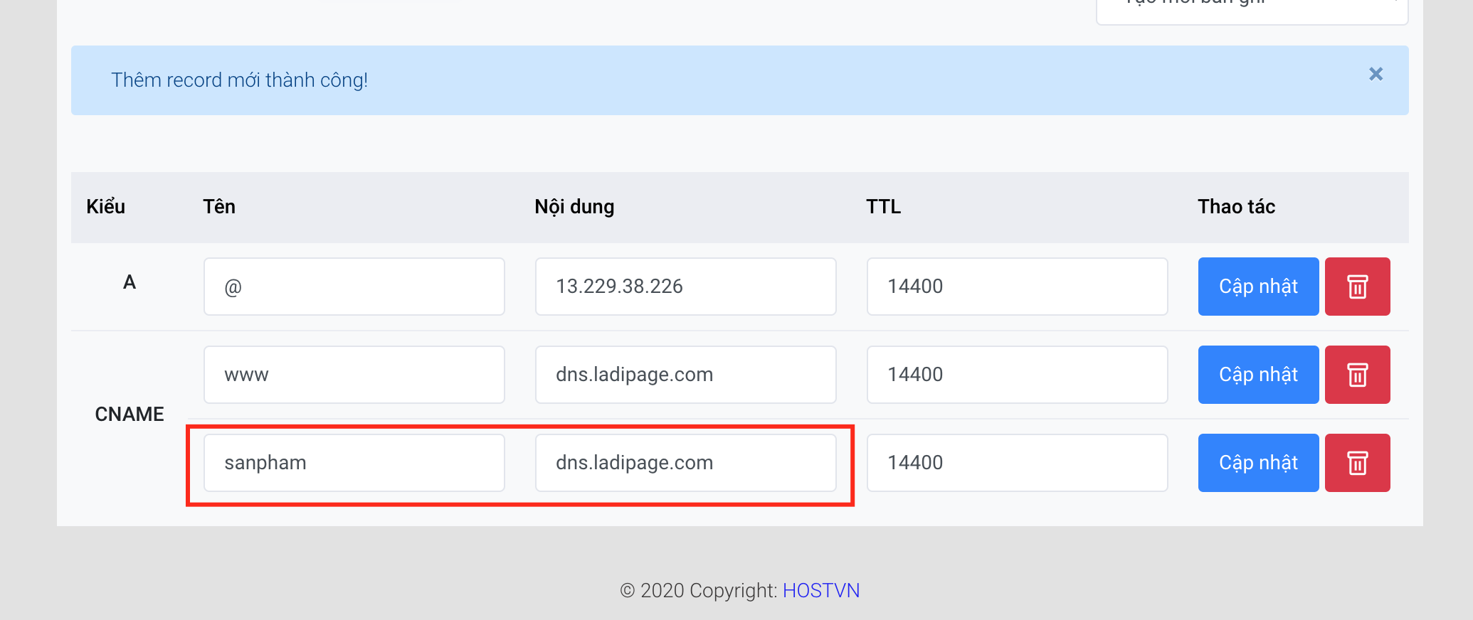Bạn tạo 2 bản ghi sau để trỏ tên miền chính trong Quản lý DNS: