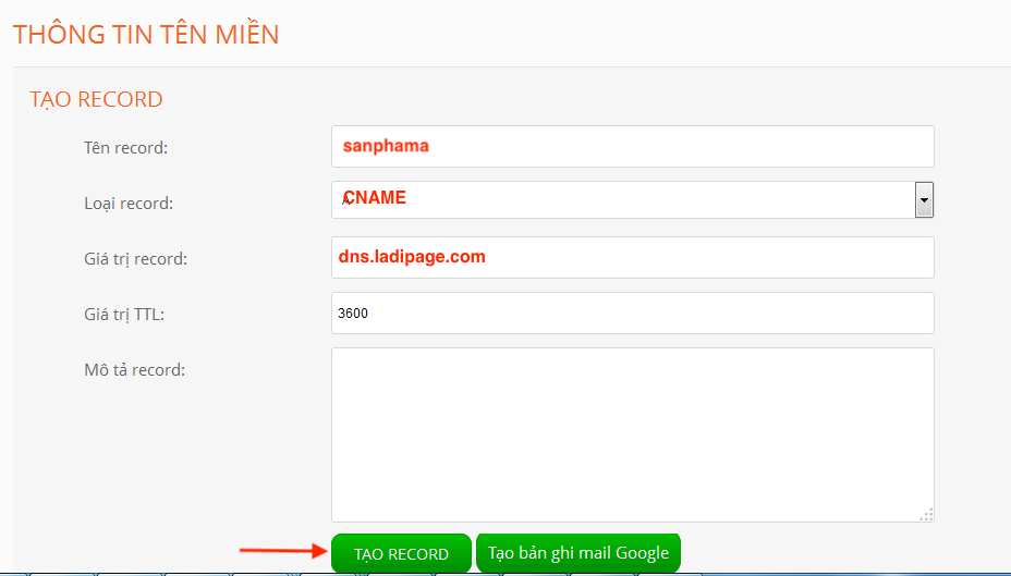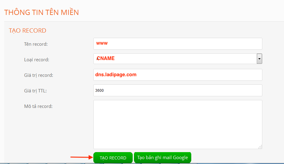 Chọn tên miền chính bạn muốn cài đặt, sau đó tạo một bản ghi mới và điền các giá trị như sau: