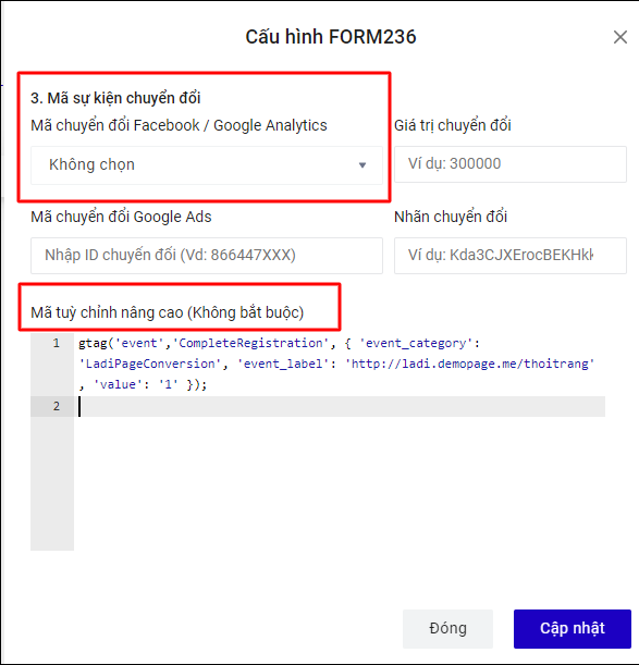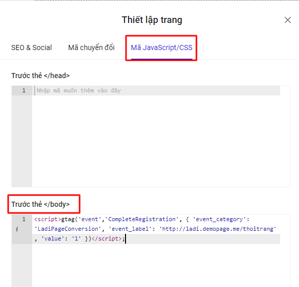 Gắn mã ID vừa lấy được trong phần thiết lập mã chuyển đổi trên LadiPage builder: