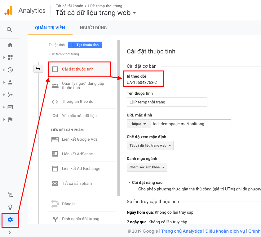 Lấy mã ID theo dõi trong phần Admin -> Cài đặt thuộc tính: