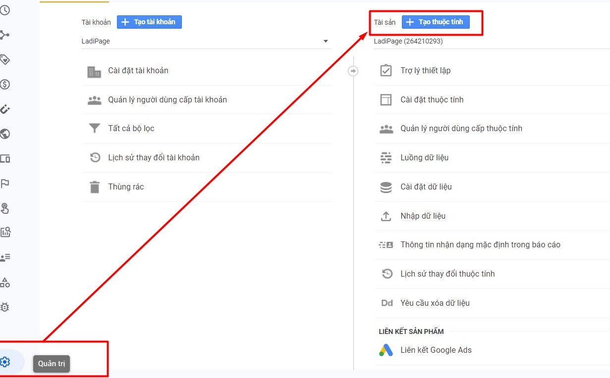 Bước 1: Trong tài khoản GA, bạn truy cập vào phần quản trị --> Nhấn tạo mới thuộc tính.