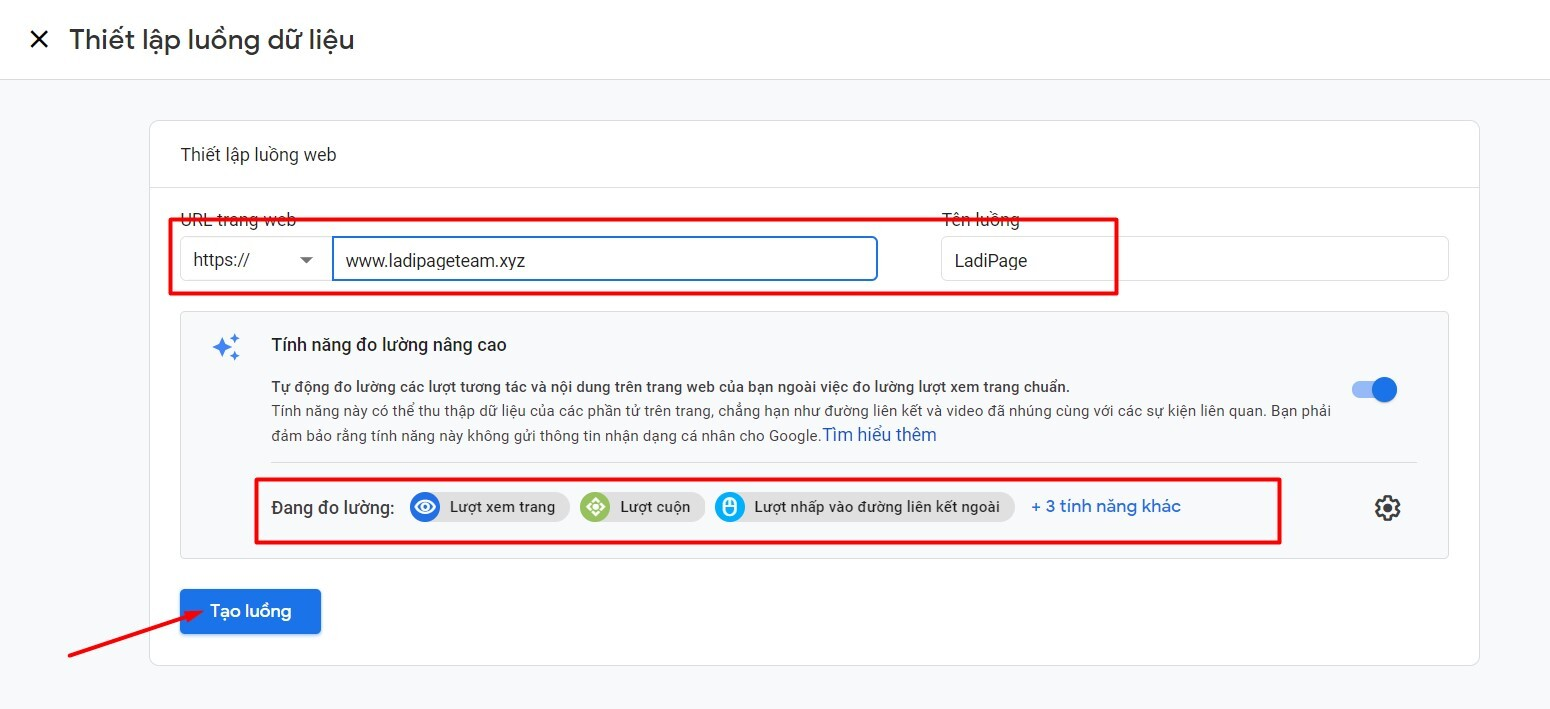 Sau đó cài đặt thông tin thu thập dữ liệu cho website của bạn, sau đó nhấn “Tạo luồng” để tiếp tục cài đặt.