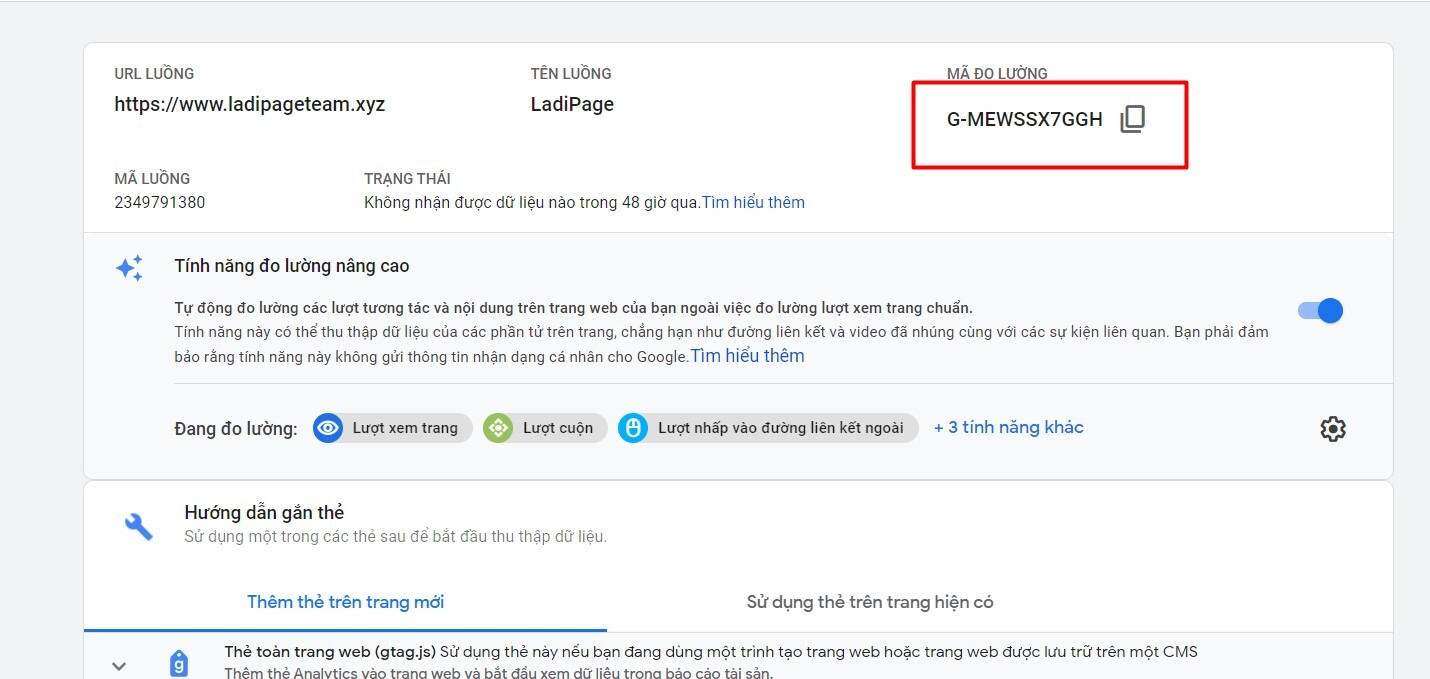Sau khi nhấn “Tạo luồng” mà hình tiếp theo sẽ hiển thị thông tin về thuộc tính và cách cài đặt. Bạn sao chép Mã đo lường có định dạng: G-AAAAA, mã này chính là ID của GA4 để cài đặt ID GA của landing page.