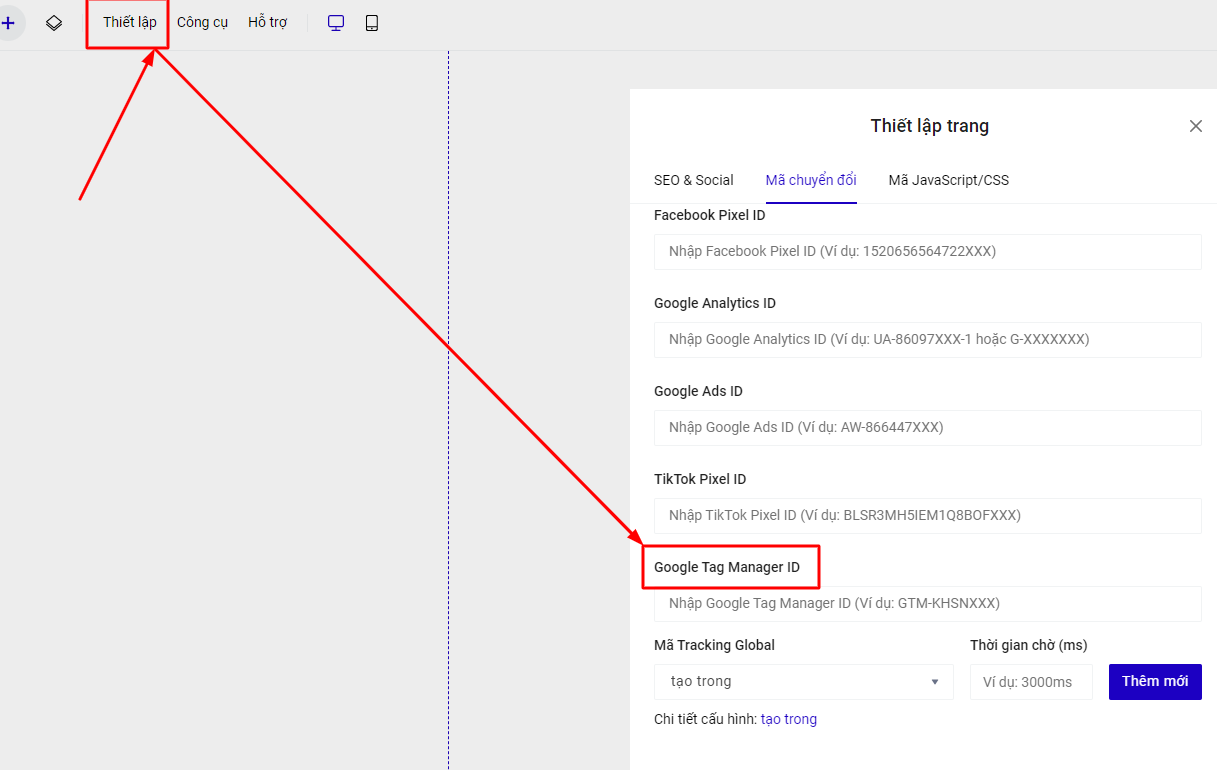 Chỉ nhập duy nhất Google Tag Manager ID trên thiết lập toàn trang, ngoài ra không sử dụng các mã theo dõi sự kiện có sẵn trên LadiPage.