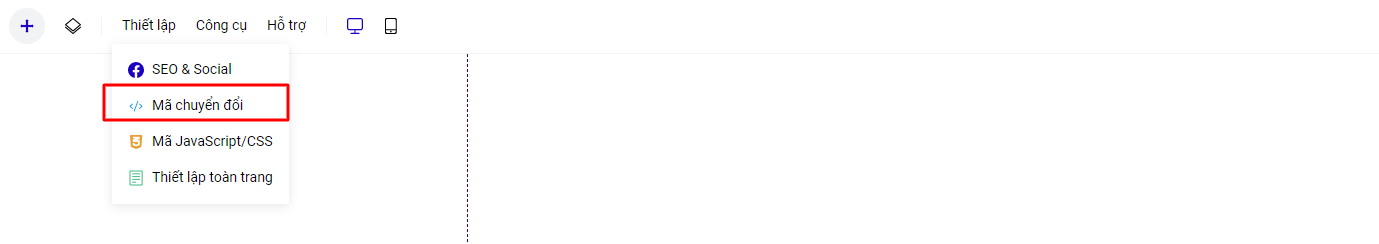 Sau đó ở trang Landing Page khác, nếu muốn sử dụng lại cấu hình này bạn chỉ cần chọn tên cấu hình trong danh sách là xong: truy cập mục Thiết lập- Mã chuyển đổi