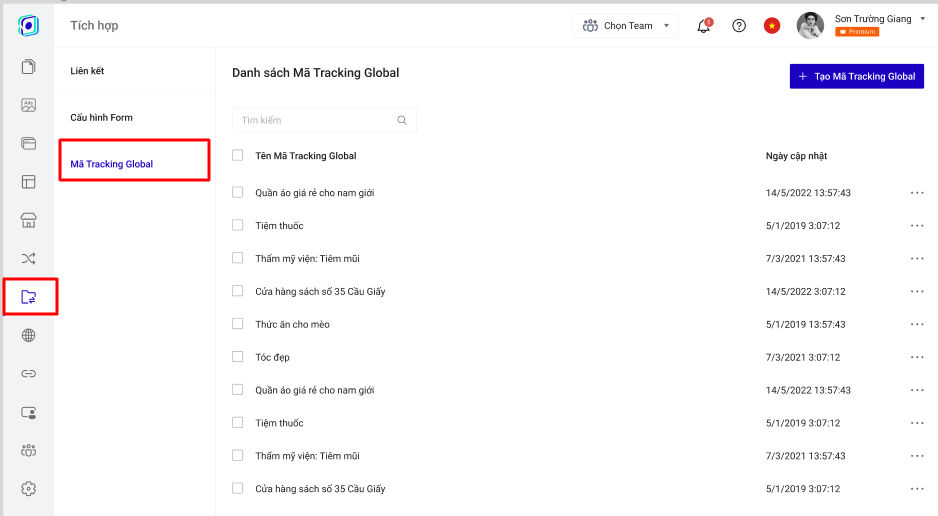 Hoặc bạn có thể vào trực tiếp phần Tích hợp- Mã Tracking Global