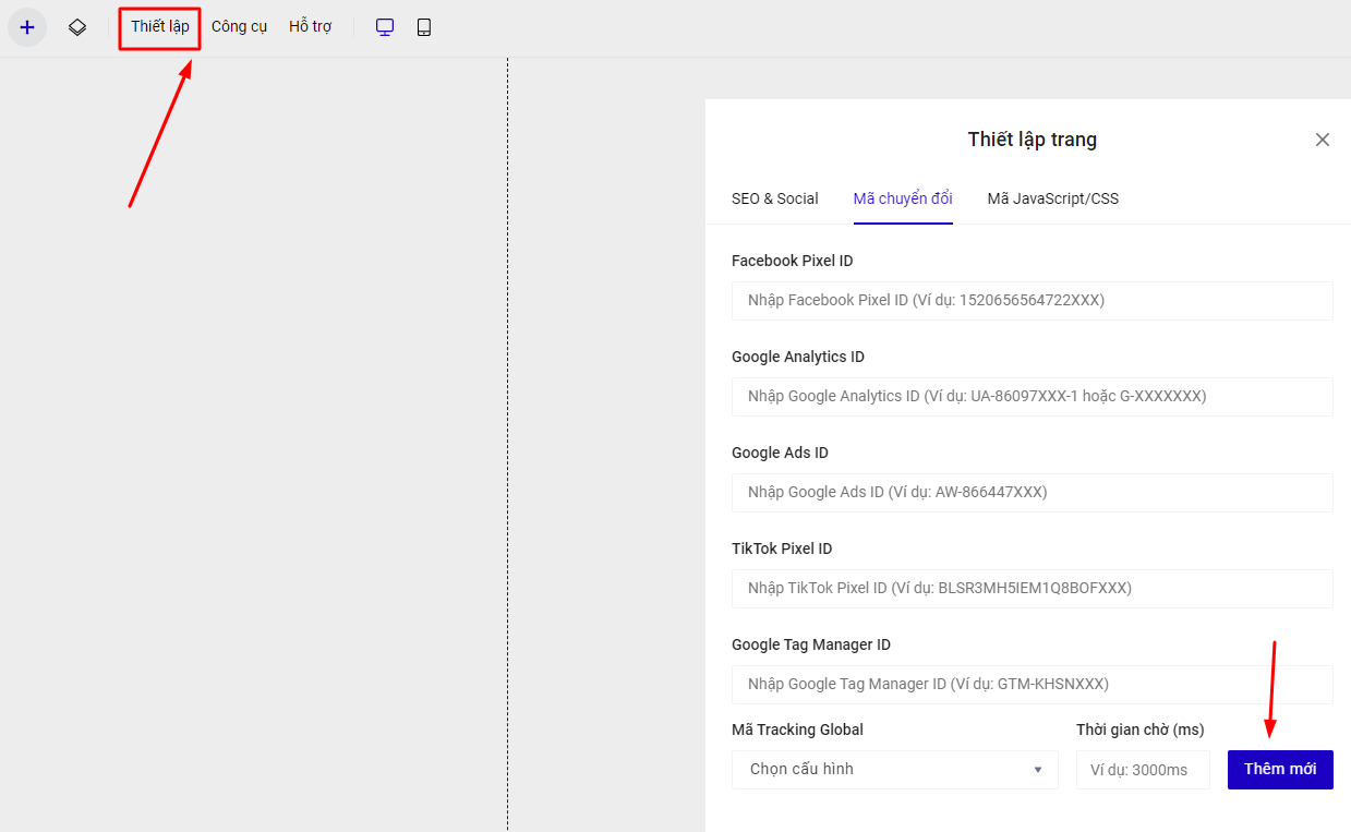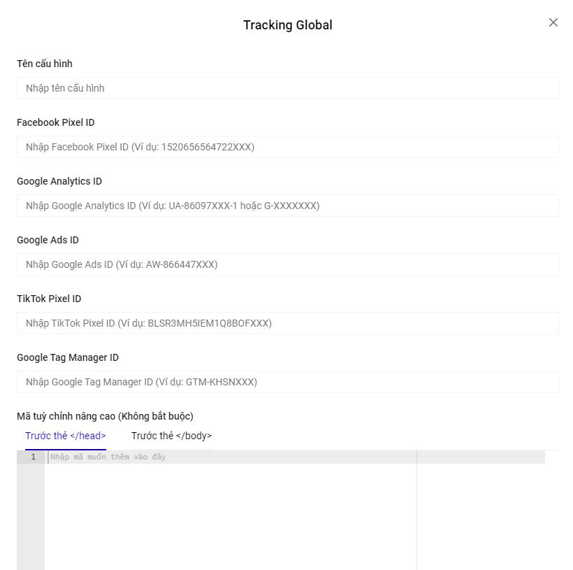 Lưu ý: Khi đã điền các mã ID theo dõi trong cấu hình mã tracking global thì không điền các mã ID ở ngoài phần thiết lập của landing page nữa.