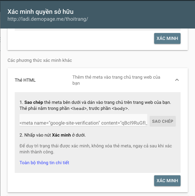 Để xác minh quyền sở hữu của trang có tiền tố URL (dạng https://ladipage.vn/banggia), bạn cần chọn phương thức xác minh bằng thẻ HTML: