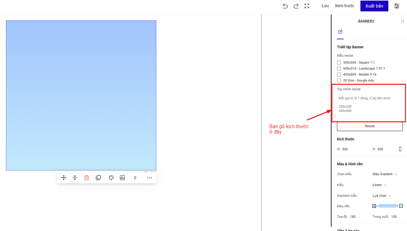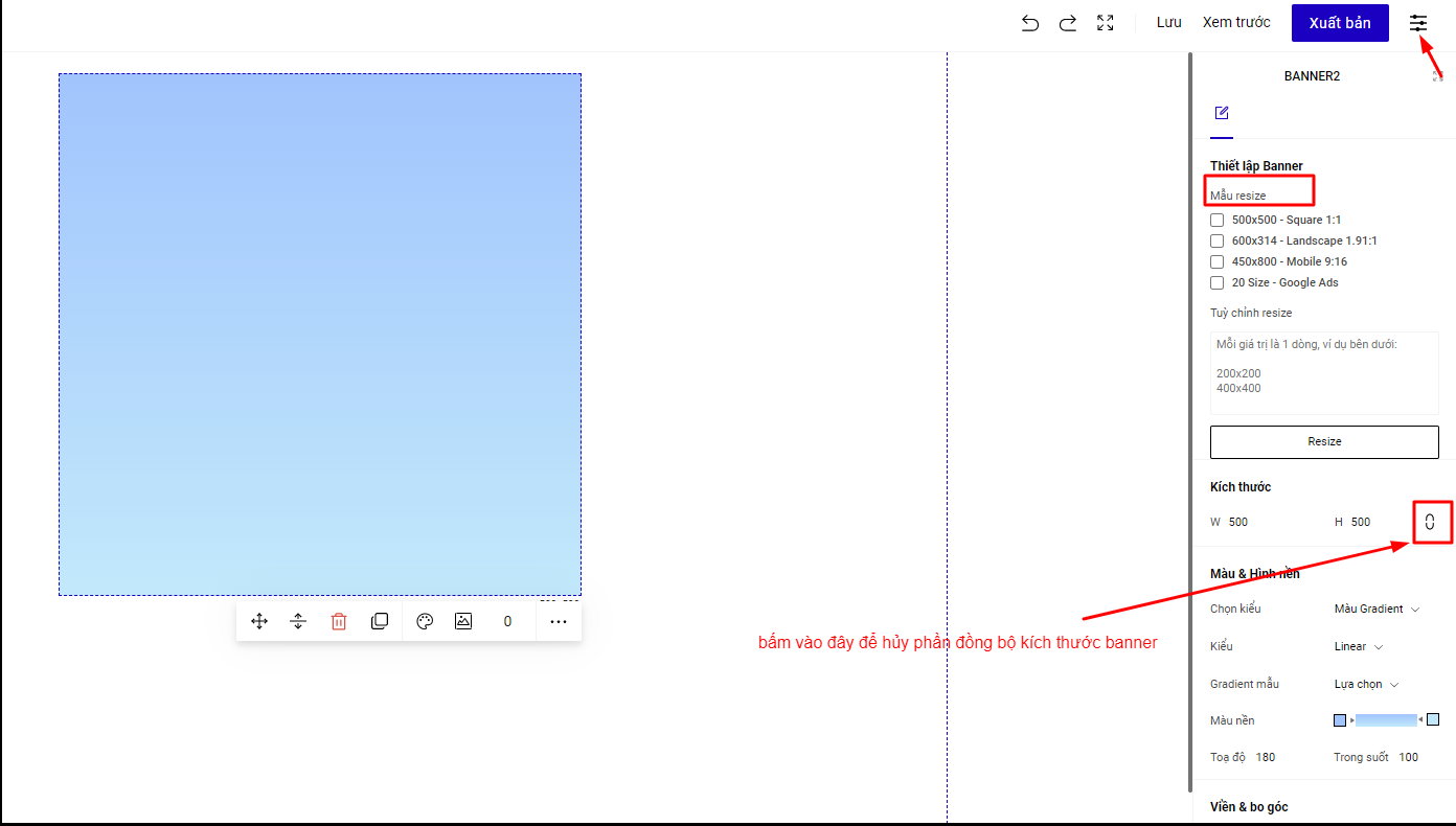 Trong phần Thuộc tính ở Banner, hệ thống đã tạo sẵn 1 số kích thước Banner phổ biến nhất để bạn chọn sử dụng. Trong trường hợp bạn muốn tùy chỉnh lại kích thước của Banner, bạn vào mục Kích thước, hủy đồng bộ chiều rộng, chiều dài, rồi thiết lập lại theo kích thước mong muốn.
