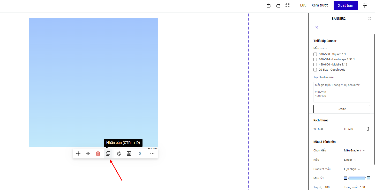 Trong trường hợp bạn muốn thiết kế 1 loạt các banner giống nhau hoàn toàn về nội dung , phần tử, thì bạn sẽ sử dụng tính năng Resize banner hoặc Nhân bản Banner