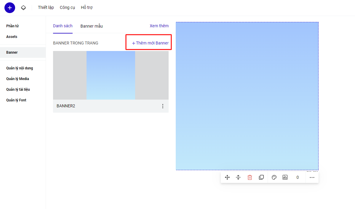 Bạn đang thiết kế banner và muốn tạo thêm 1 banner mới, nội dung độc lập với banner đang thiết kế thì bạn sử dụng tính năng Thêm mới Banner