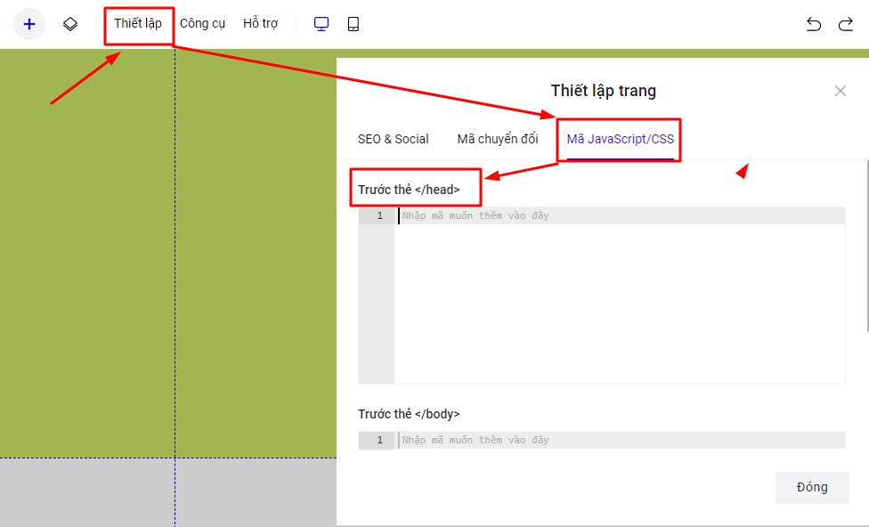 Cách 2: Vào mục Thiết lập- Mã javascripts/css. Bạn paste phần code PopupX SDK đã copy ở bước 1, chèn vào mục Trước thẻ </head>