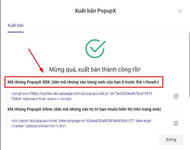 Truy cập vào trang chỉnh sửa PopupX, mục Xuất bản, copy phần code Mã nhúng PopupX SDK