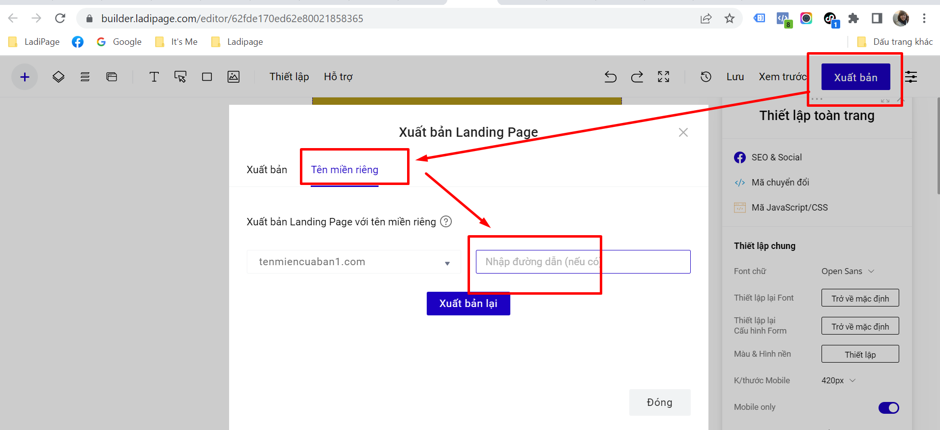 - Trong trang chỉnh sửa landing page, bấm Xuất bản.